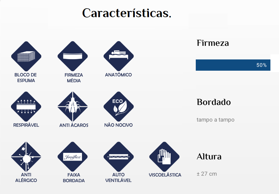 Colchão Versátil Joviflex: Composto por um bloco de espuma de alta densidade e pelo sistema extra conforto de viscoelástica, este modelo oferece uma fantástica adaptabilidade aos contornos corporais Bloco de espuma de alta densidade