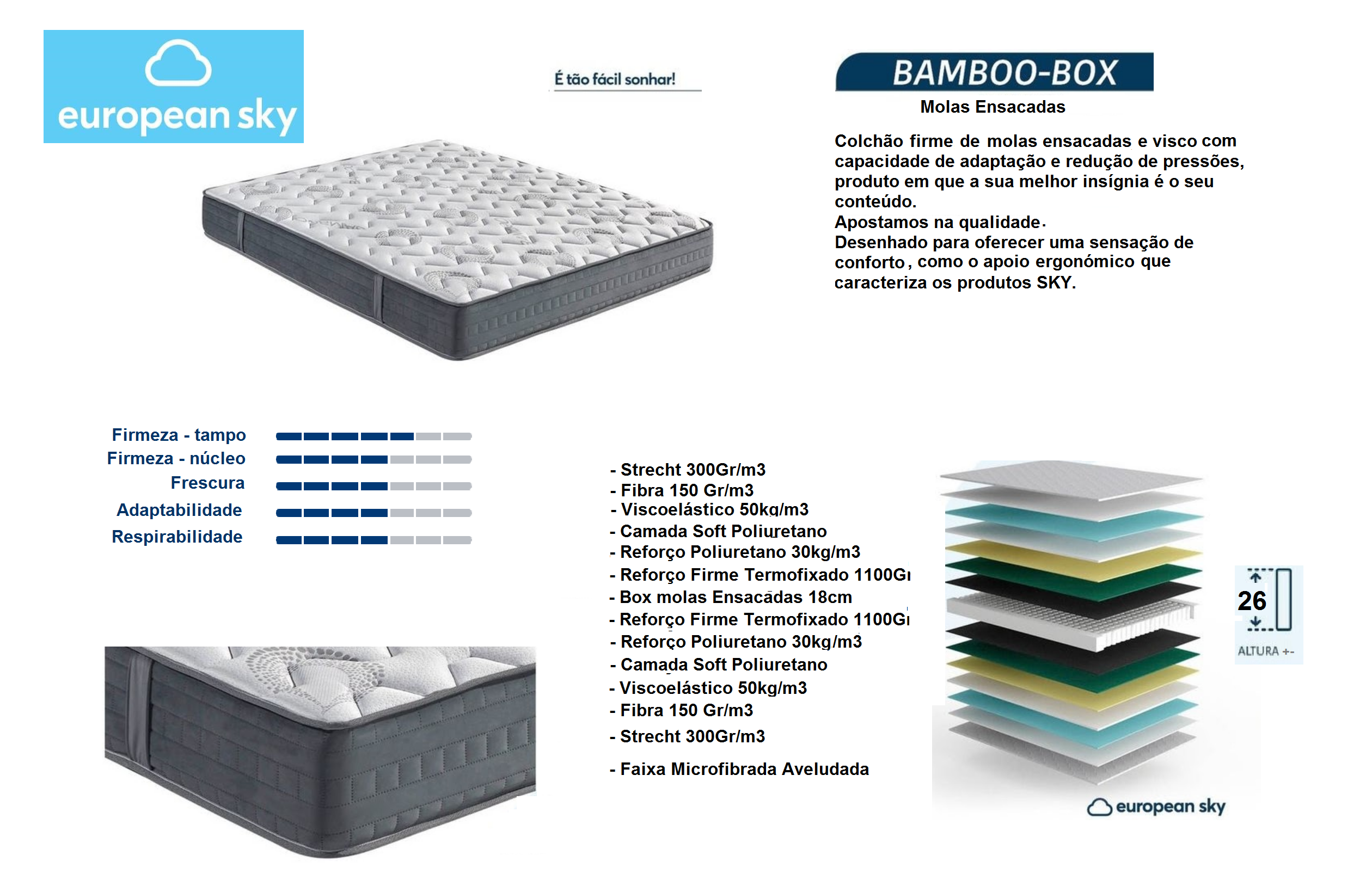 O Tecido Strecht Bamboo de alta qualidade de 280 gr/m3 oferece um toque suave e fresco, mantendo-o confortável durante toda a noite. As fibras hipoalergênicas, tornam-no numa opção ideal para pessoas com sensibilidades na prevenção a alergias.