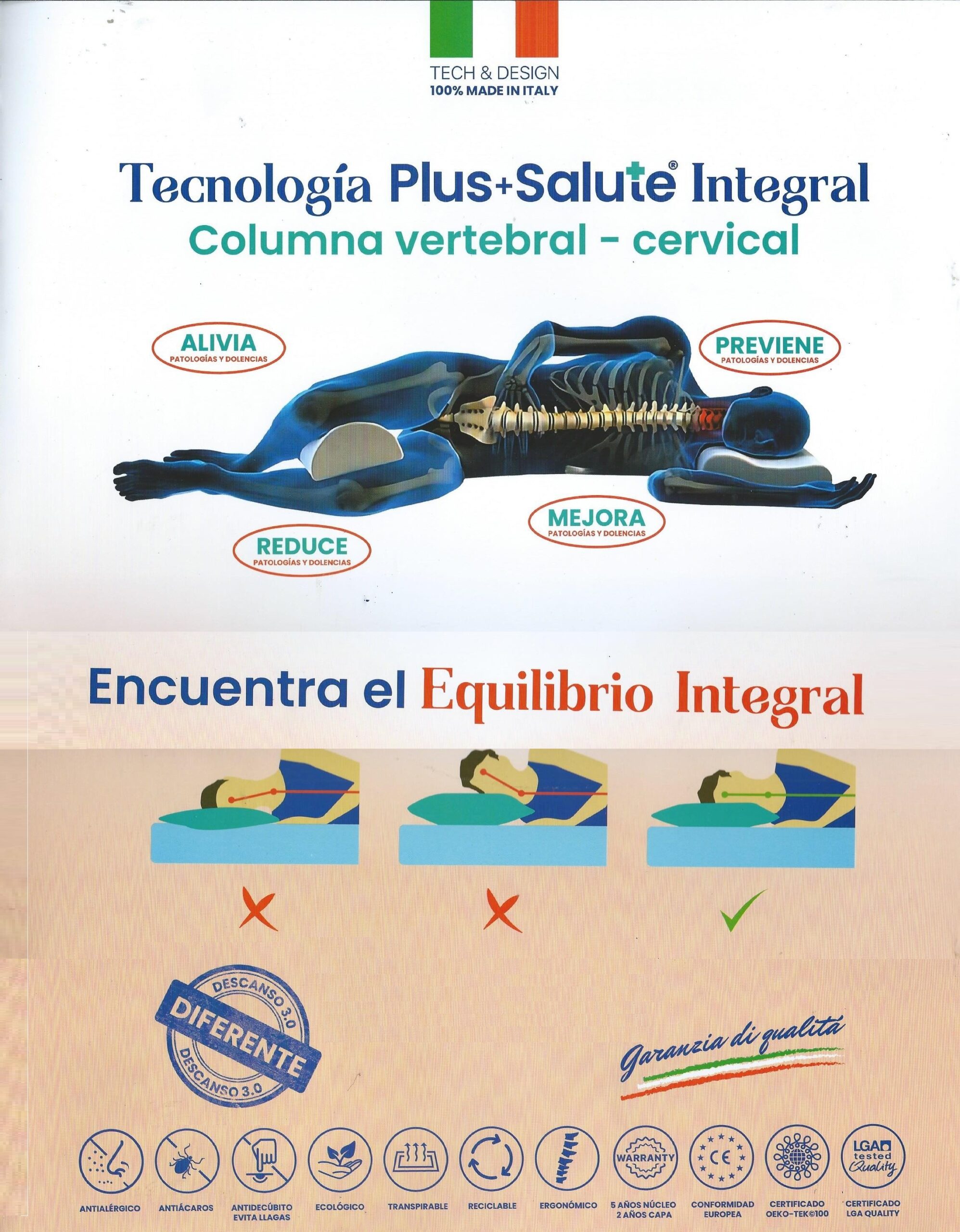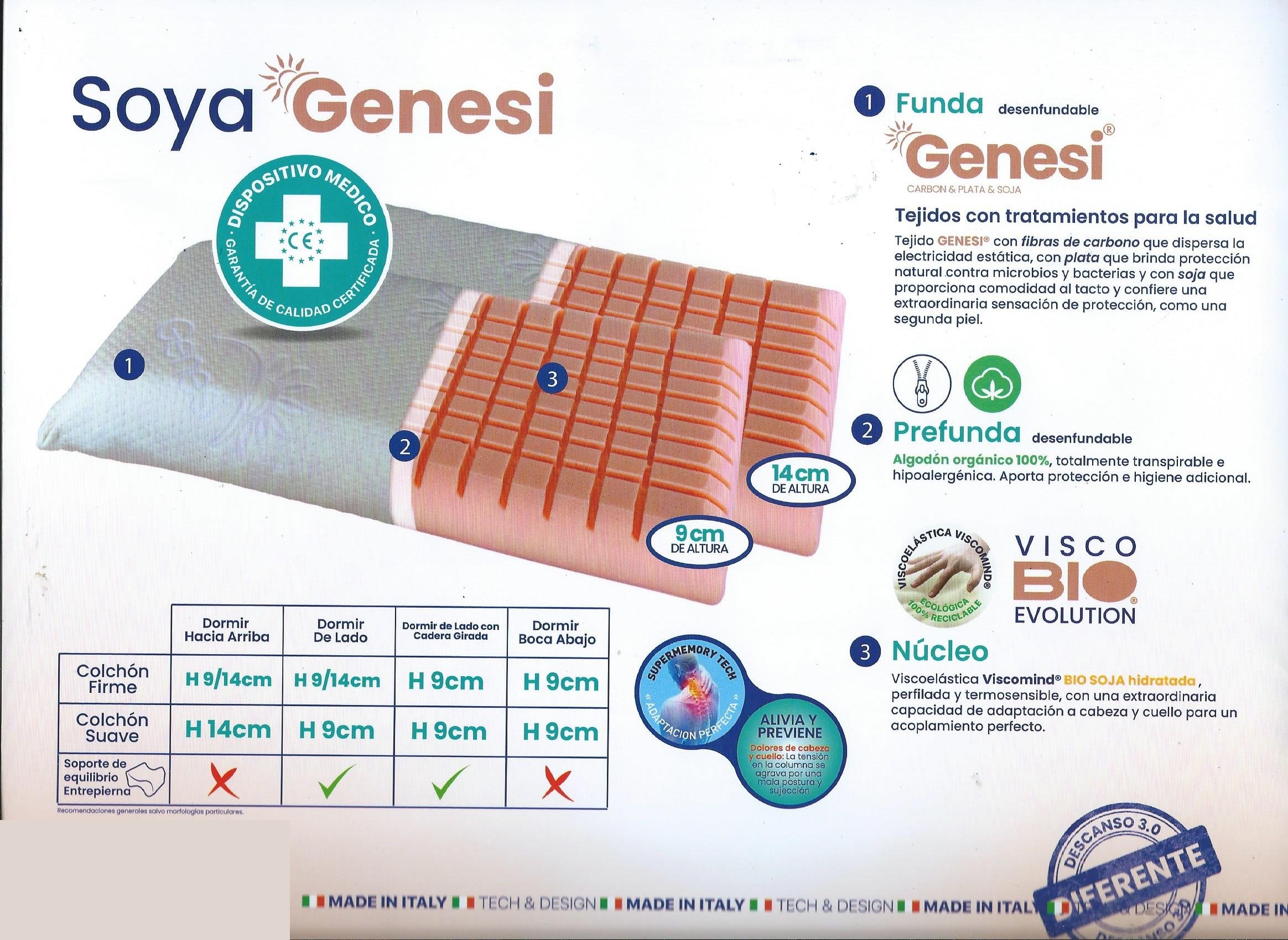 Núcleo: viscoelástica ViscoMind® BIO SOY a hidratada , perfilada e termossensível, com extraordinária capacidade de adaptação à cabeça e pescoço para um ajuste perfeito.