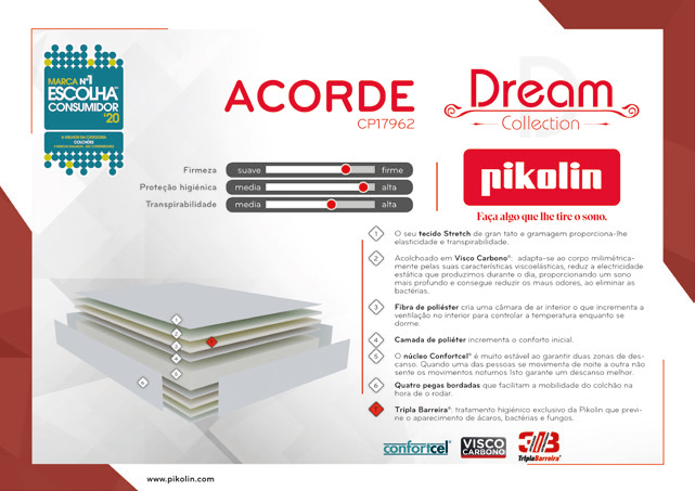 O Acorde 2.0 dream collection é um colchão de material celular com Visco Carbono de alto desempenho na sua camada de acolchoado, graças à qual oferece benefícios relaxantes devido ao seu efeito antiestático. A combinação do viscocarbono com a fibra de poliéster de alta densidade permite criar uma câmara de ar no interior do colchão para aumentar a ventilação interna e controlar a temperatura enquanto dorme. O seu núcleo de material celular Confortcel garante estabilidade durante o sono e permite que não se aperceba dos movimentos do seu parceiro ao dormir. Todos os colchões da Pikolin possuem a tecnologia de higiene total Barreira Tripla que protege e previne o desenvolvimento das principais fontes de bactérias num colchão: ácaros, bactérias e fungos.