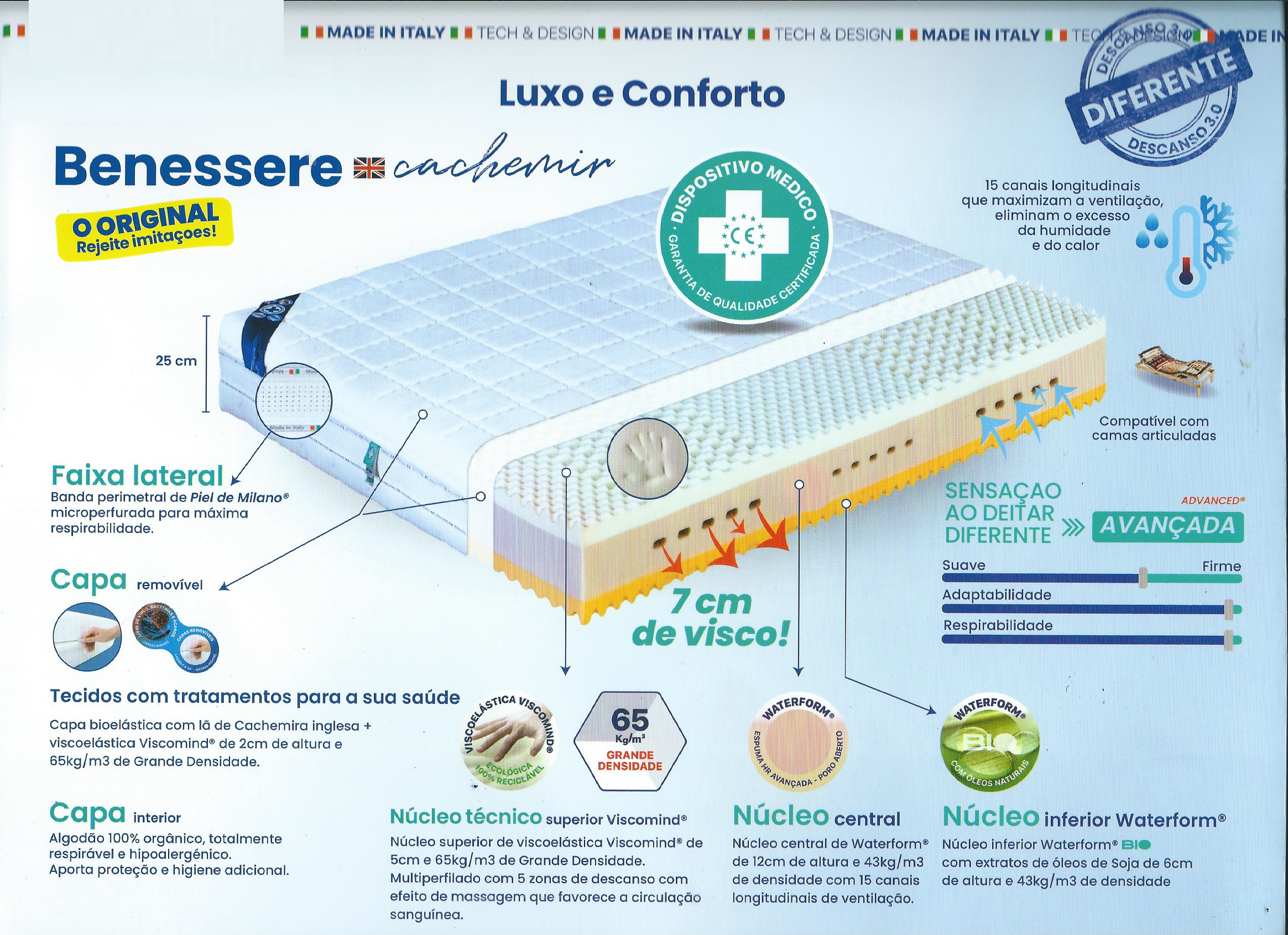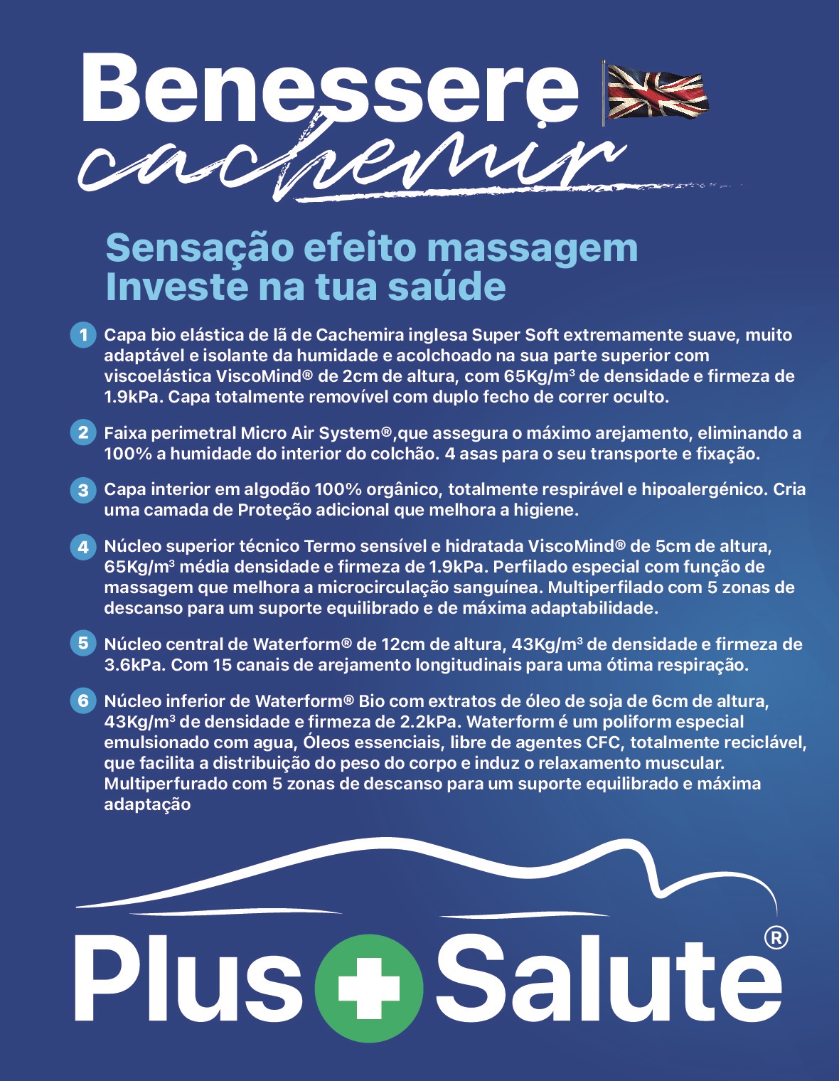 Colchão Benessere Cachemir Plus Salute (Saúde+), Sensação de efeito de massagem, melhora a micro circulação sanguínea graças ao perfilado especial da viscoelástica.