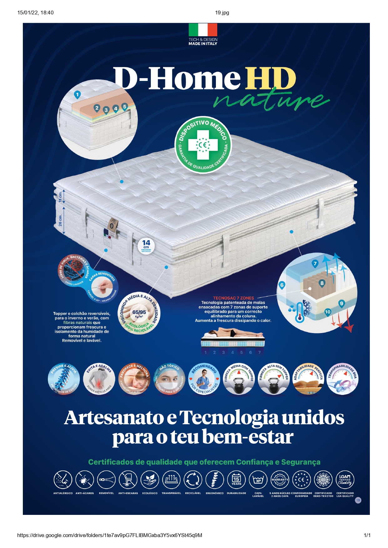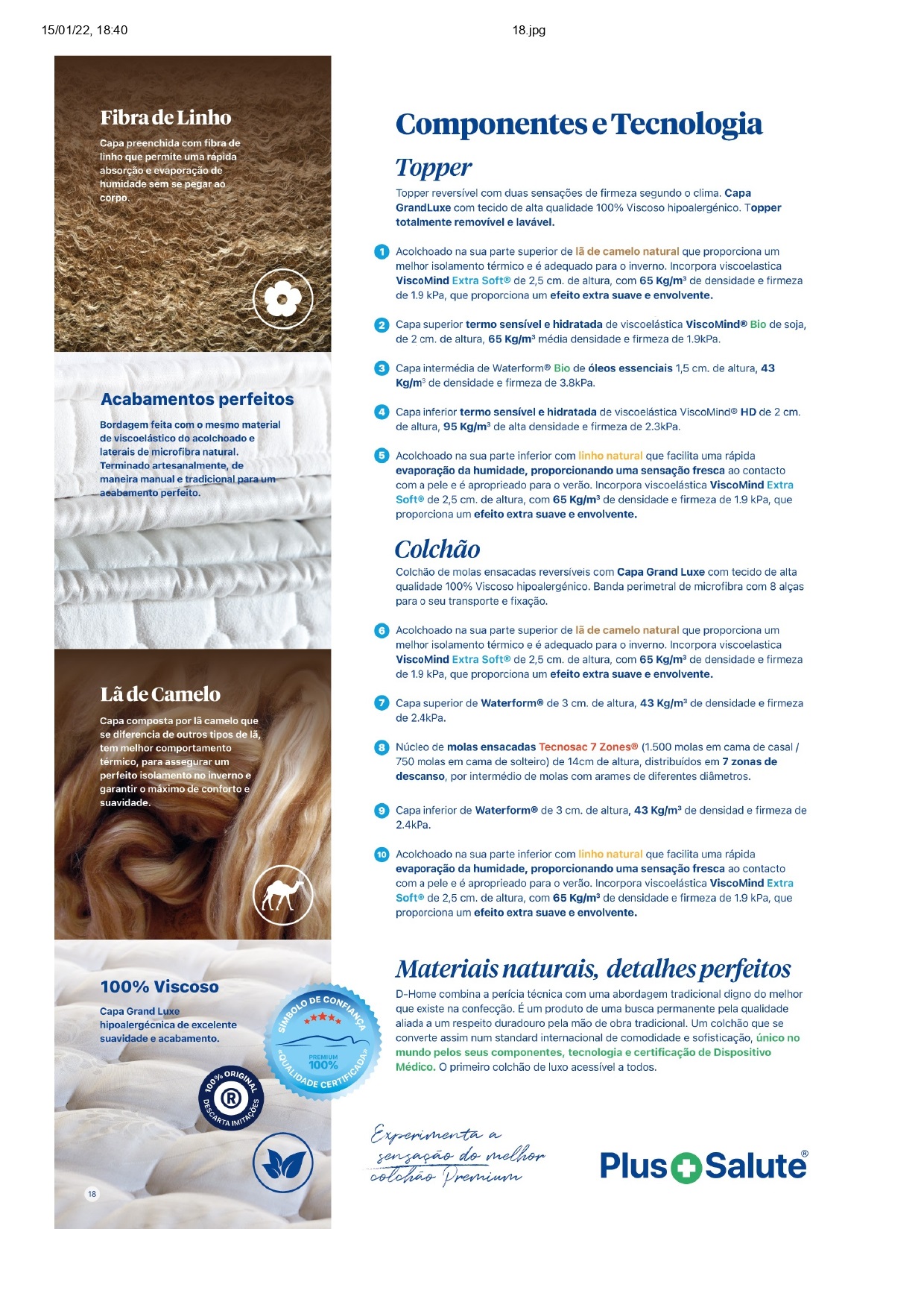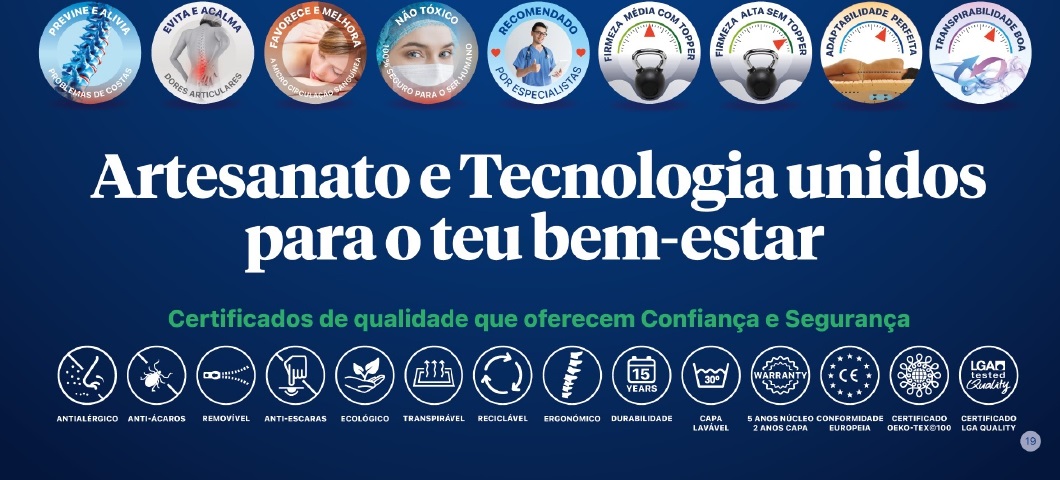 D-Home HD da Plus Salute (molas Ensacadas+Topper, Aprov. Infarmed, ded. no IRS) Topper e colchão reversiveis, para o inverno e verão, com fibras naturais que proporcionam frescura e isolamento da humidade de forma natural. Capas removíveis e laváveis, livres de vírus e bactérias. Altura do Colchão: +- 26 cm + altura topper;: +- 11cm tecnologia TECNOSAC 7 ZONES, patenteada, de molas ensacadas com 7 zonas de suporte equilibrado para um correcto alinhamento da coluna. Aumenta a frescura dissipando o calor. Certificados de qualidade que oferecem confiança e segurança: Antialérgico – Antiácaros – Anti escaras – Ecológico – Transpiravel – Reciclável – Ergonomico