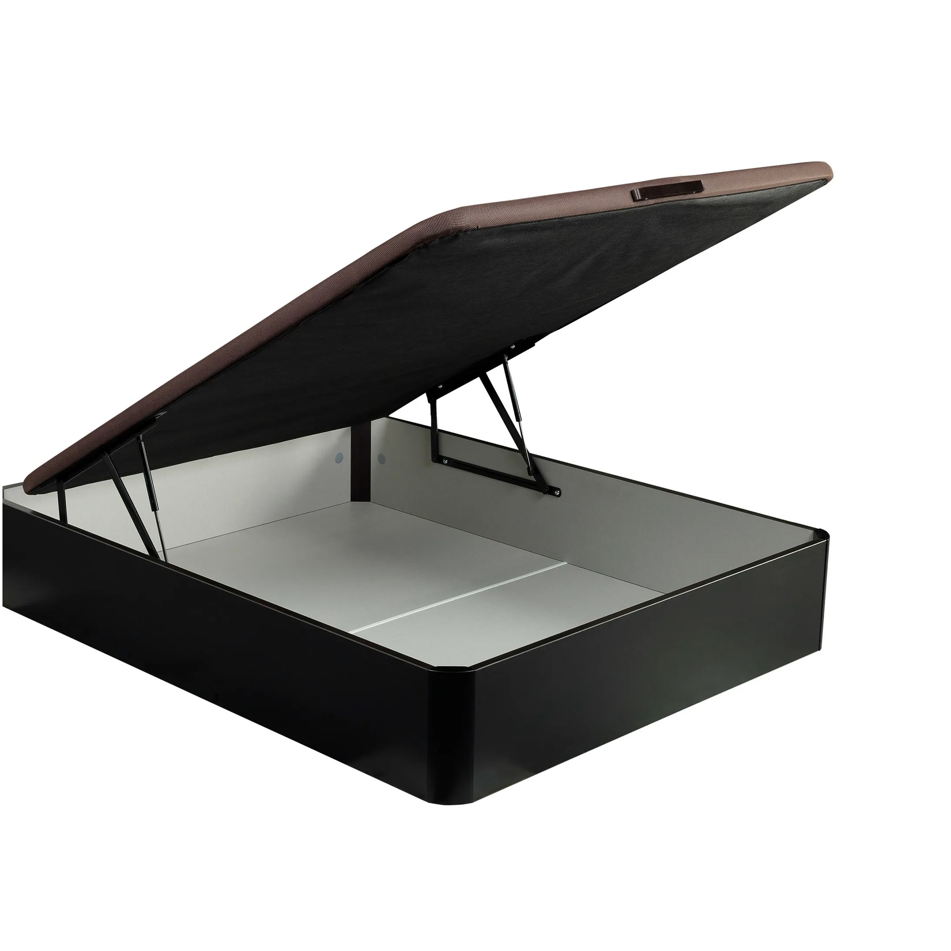 CAIXA DE ARRUMAÇÃO: Laminados exteriores e interiores modernos. Cantos diferenciados em madeira maciça que definem a posição do sommier rebatível: – linhas retas á frente, linhas curvas para a peseira. Traves da caixa de arrumação com 25 mm de espessura. Acesso ao interior a partir de qualquer ângulo.