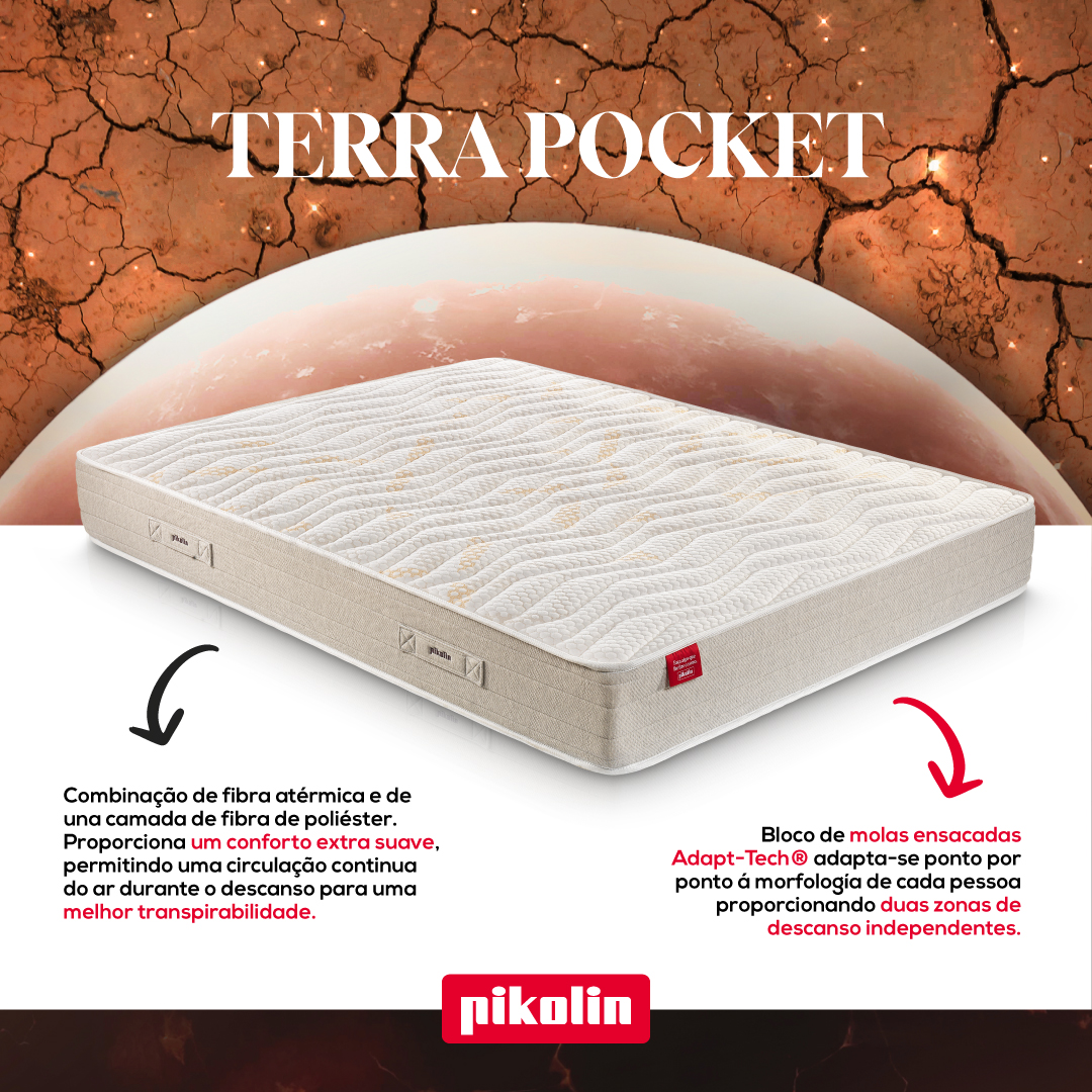 O Colchão PIKOLIN Terra Pocket CM11696- Bloco de molas Ensacadas Adapt-Tech® independentes umas das outras e embolsadas em tecido resistente e duradouro que se adapta ponto por ponto à morfologia de cada pessoa, proporcionando duas zonas de descanso independentes com uma firmeza média. A tecnologia Fibercel® foi concebida para proporcionar um conforto extra suave, permitindo uma circulação contínua do ar durante o descanso para uma melhor transpirabilidade, o que evita a humidade e oferece uma melhor ventilação de forma a garantir um ótimo descanso. TRIPLA BARREIRA®Tecnologia que atua contra ácaros, bactérias e fungos Previne e impede o aparecimento e desenvolvimento dos ácaros e os seus alérgenos. Previne e impede o aparecimento de um vasto espetro de fungos. Previne e impede o aparecimento de bactérias num espetro mais vasto. E certamente, um tratamento totalmente inócuo para quem dorme. Altura: +- 24cm