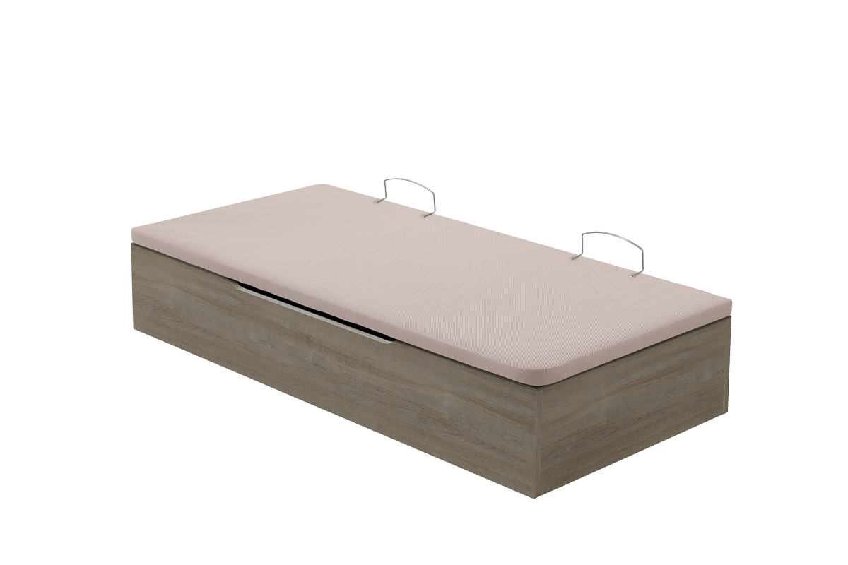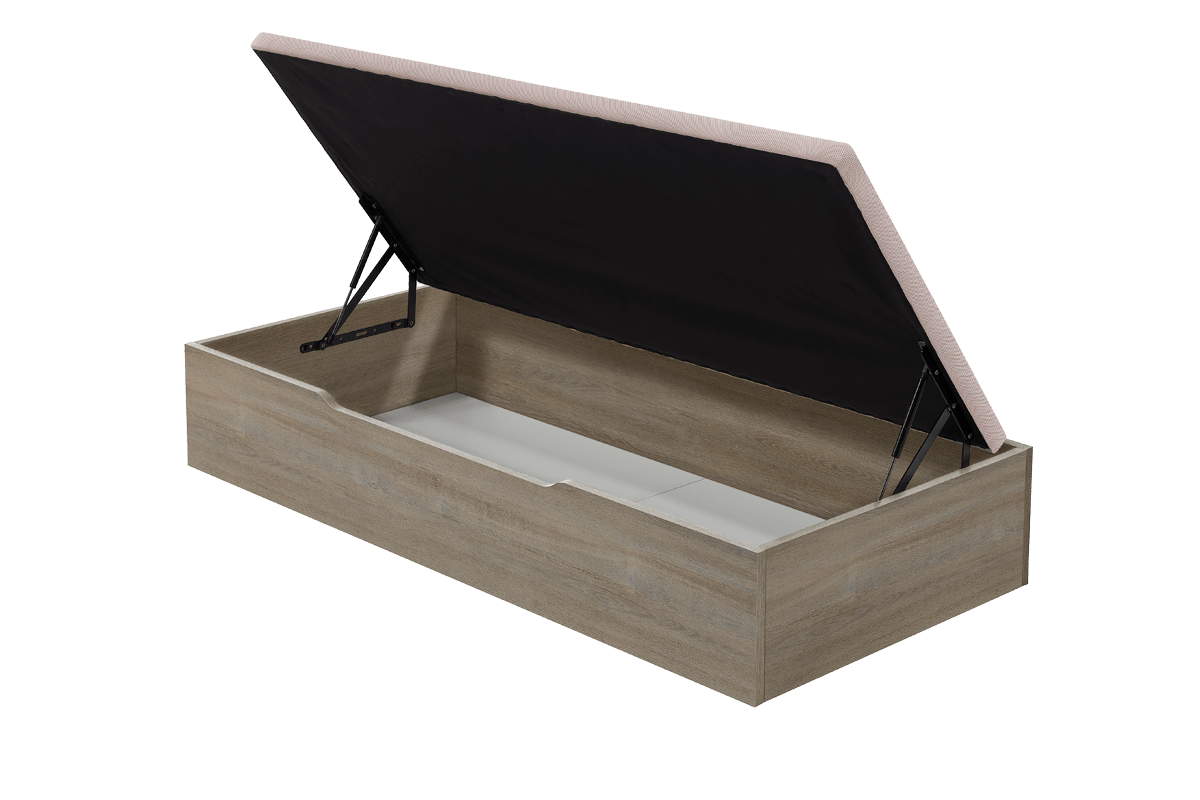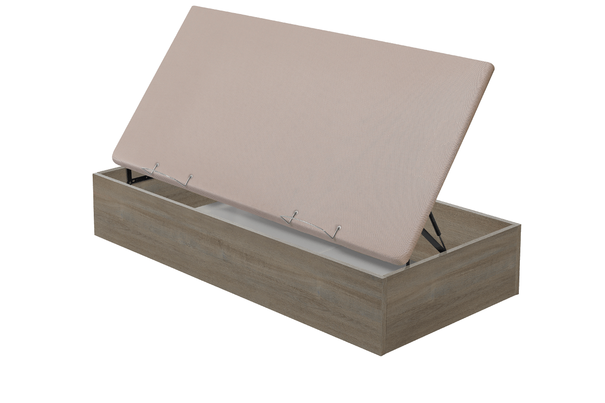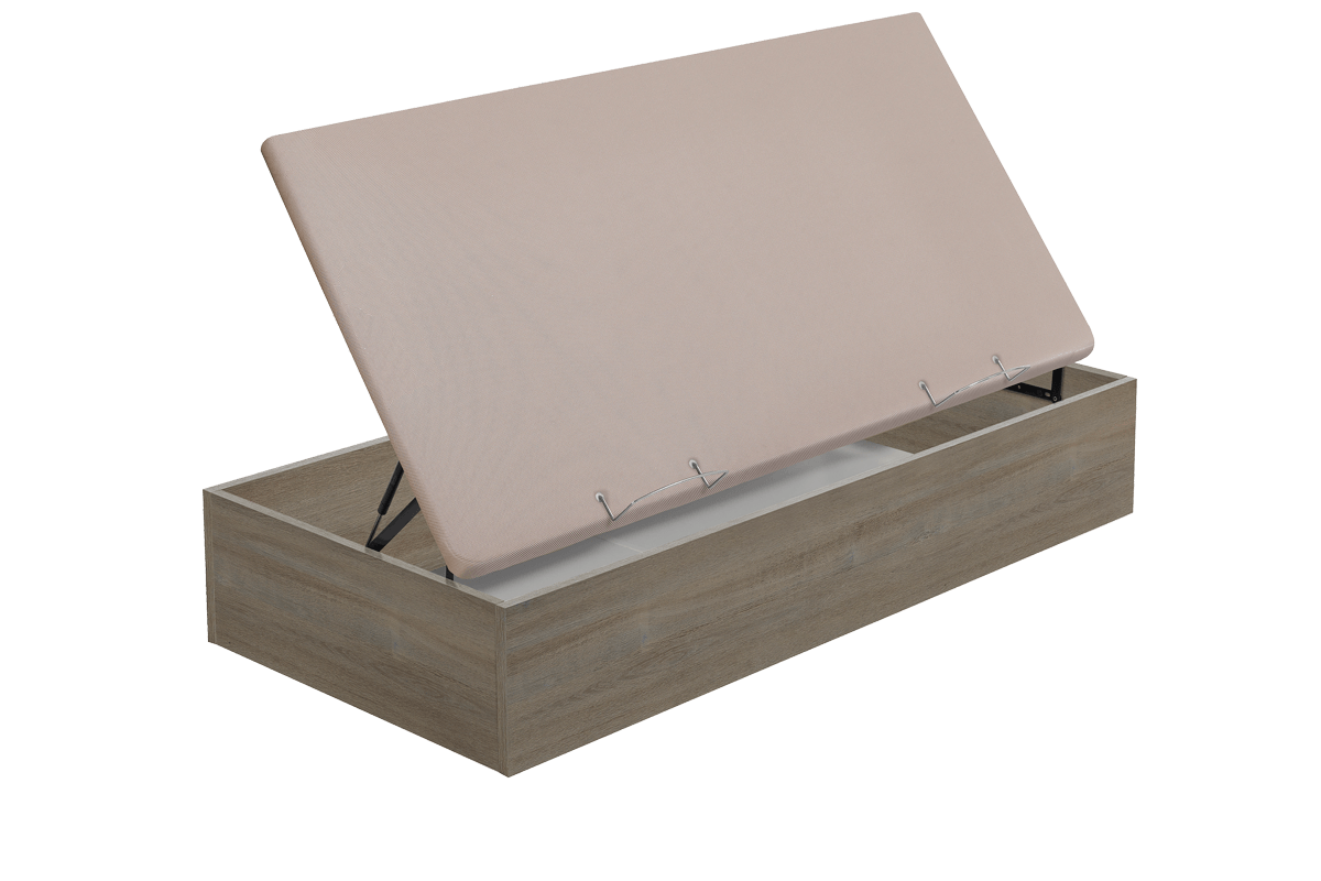Sommier imit. madeira c/ arrumação de 31cm altura no interior, tampa elevatória LATERAL forrada a 3D anti.deslizamento e arejamento. (h38)